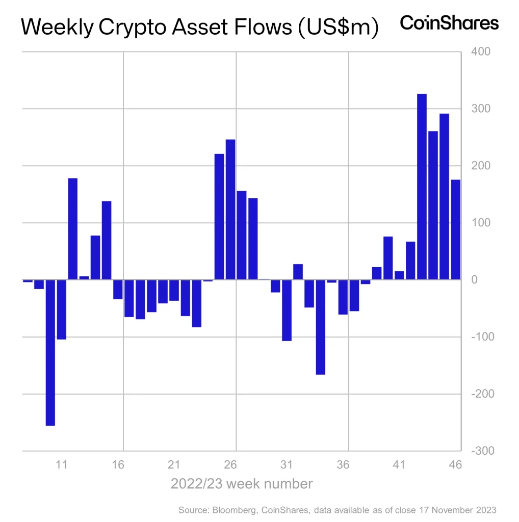 Investments in cryptocurrency funds continued last week. Thus, the flow of money into funds remained positive for 8 consecutive weeks. The total amount invested last week was 176 million dollars.