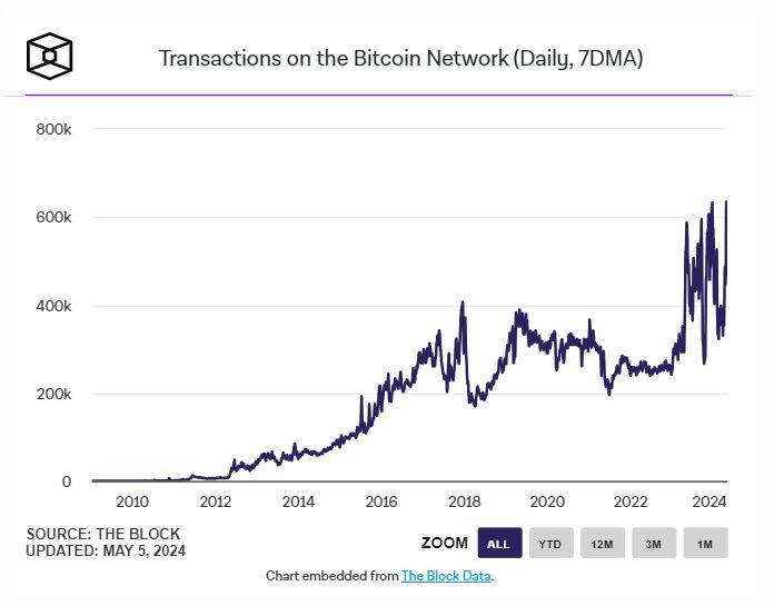The chart below shows the trajectory of the number of transactions on the network since Bitcoin’s inception.