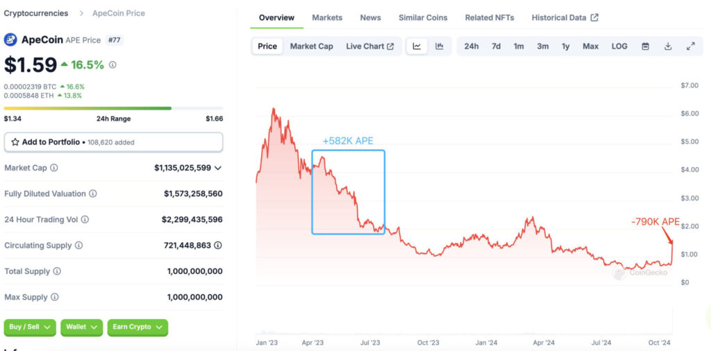 APE, which has increased by more than 100% in the last 2 days, has risen above $1.5. The rise in the token, which attracted great attention with the launch of ApeChain, was seen as an escape opportunity for a whale who suffered serious losses.