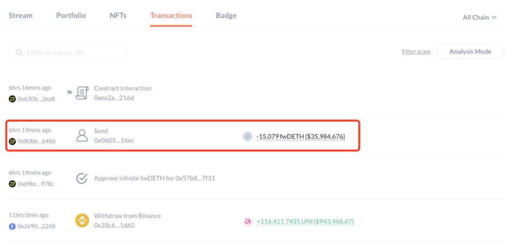 In the incident that took place tonight, the account that pressed the bait signature button allowed the hacker to take control of the wallet. The account that seized 15079 fwDETH immediately sold the tokens. After the fwDETHs were sold, the DETH price also dropped by more than 90%.