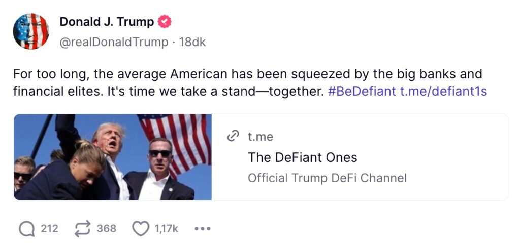 In the post shared from Trump’s official account, “For too long, the average American has been squeezed by the big banks and financial elites. It’s time we take a stand-together.”