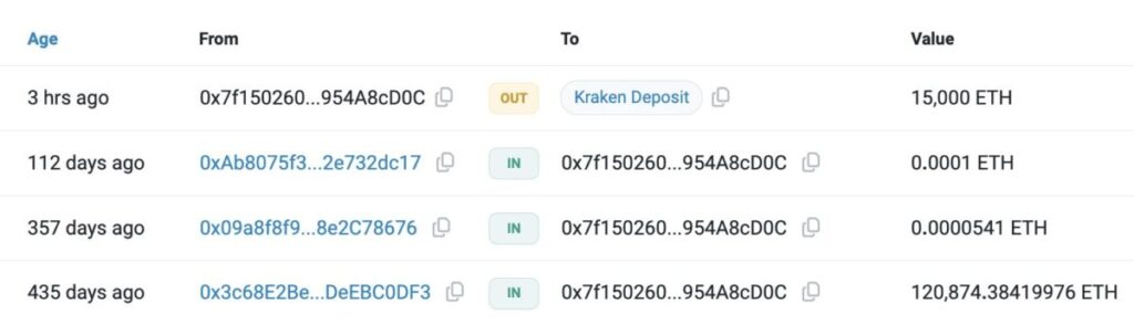 A cryptocurrency whale deposited 15,000 ETH into Kraken, which is worth about $46M