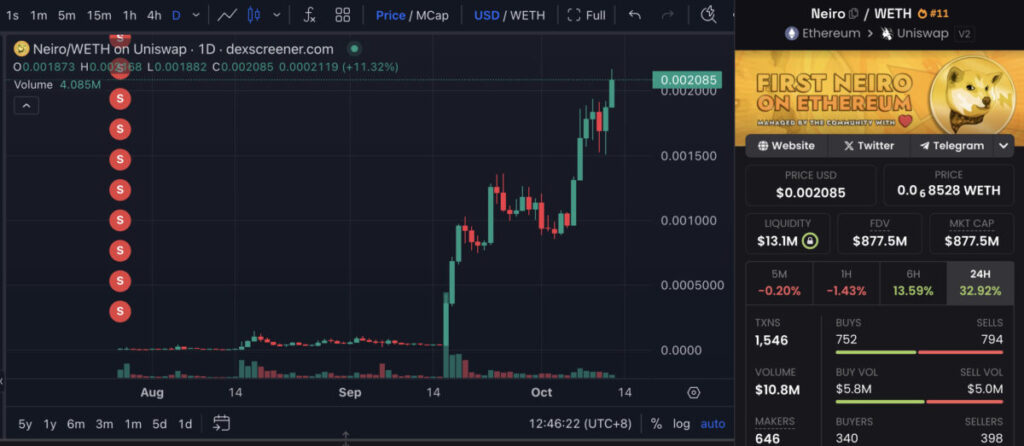 As of October 15, that is, today, Neiro, which ATH and broke a record, reached up to $ 0.0022. However, on the day the trader bought, the price was around $0.000004. In other words, if the trader had waited until today, he would have made about 16 thousand times profit, or in other words, he would have earned $18 million.