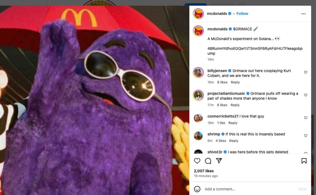 The world-famous fast food chain McDonald’s Instagram account was hacked. The hacker who took over the account promoted a meme token called GRIMACE issued on the Solana network. In the shared post, the following statements took place:
