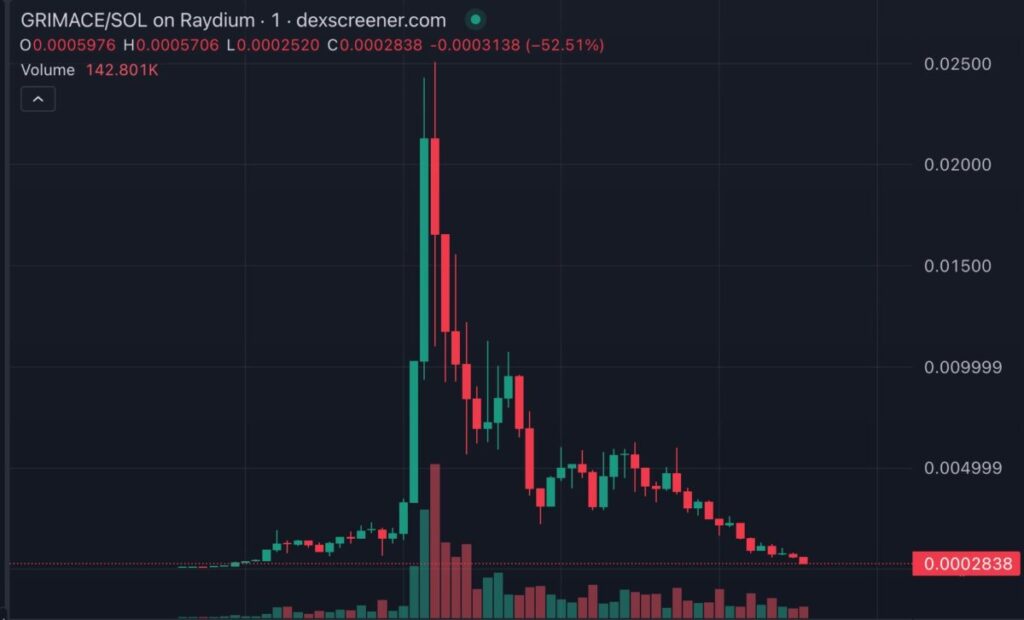 The post, which reached thousands of likes within minutes, remained on the 5 million account for at least 1 hour. After this post, GRIMACE’s market value quickly reached $20 million from $100 thousand. After it was realised that the account was hacked, the price crashed and the market value fell below $1 million.