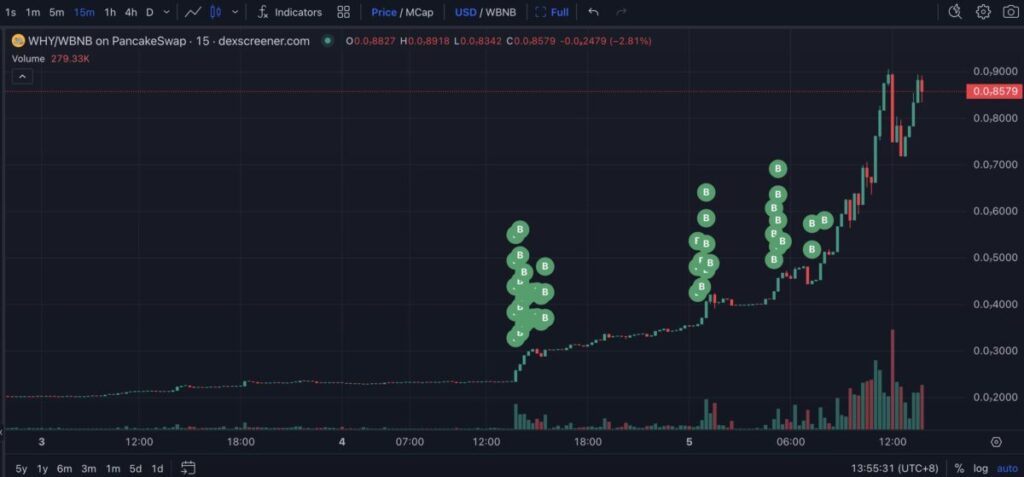 On-chain tracking firm Lookonchain found that 5 major BSC wallets bought the meme coin WHY. The 5 wallets received a total of 779 BNB (approximately $534,000) and 14.9 trillion WHY tokens. The total value of these meme tokens reached $1.3 million in a short time. The rise of the WHY meme token since overnight hours has also reached 181%.