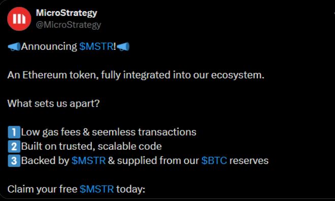 In the tweet, which stated that the token, which will be issued with the abbreviation MSTR, the share code, will be backed by the company’s Bitcoin reserves, a link was also shared “claim your free $MSTR”.