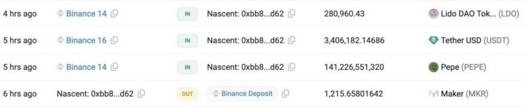Nascent, a company established in 2020 and investing in different areas of the crypto world, mostly early projects, made PEPE and LDO purchases on Binance. While the company exchanged 1215 MKR tokens worth $3.4 million, the company also withdrew 3.4 million USDT from the exchange.