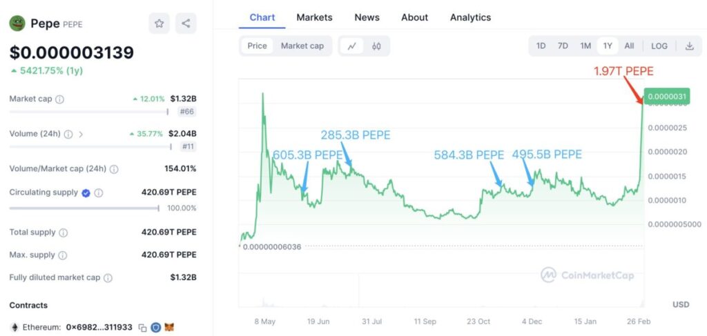 According to on-chain tracking firm Lookonchain, a whale has been collecting PEPE at low prices since June 2023. The whale, which has not bought since December, took advantage of the recent rises and managed to “cash out”. The whale sold for around $0.0000031 and made a profit of around $3.5 million.