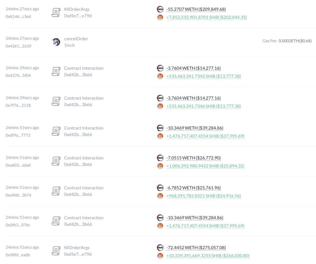 This investor spent 4849 ETH overnight, buying 715 billion SHIB tokens. The purchases were made on the decentralized exchange 1inch.