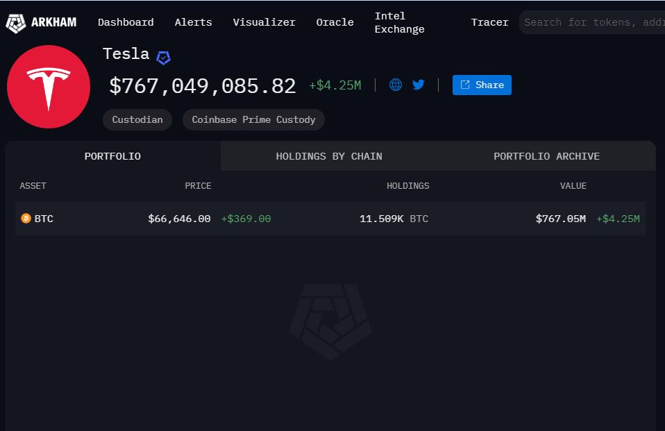 The latest data shown by Arkham states that the car manufacturer company holds 11,509 Bitcoins. If there is no mistake and this is not an accounting error, Tesla seems to have received 1789 more new Bitcoins.