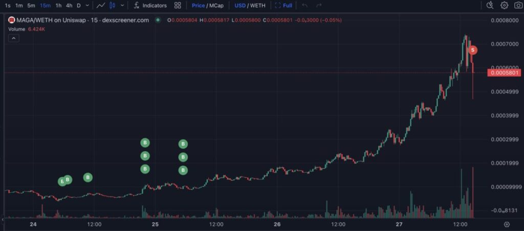According to Lookonchain’s analysis, one trader made a profit of $2.7 million in 3 days with a return of 505%. The trader, who bought 6 billion MAGA worth 537 thousand dollars on the 24th and 25th of the month, sold 1.5 billion of these tokens this morning.