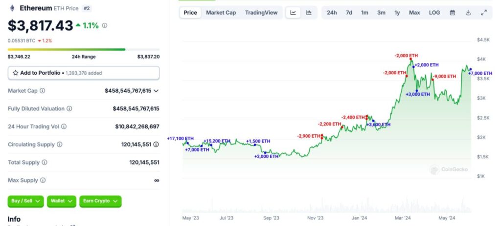 Since May last year, this person, who has almost always bought low and sold high since May last year, sold 9000 ETH before the last Ether drop. This Ether whale currently holds $140 million worth of ETH and his total profit is around $76 million.