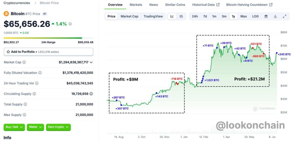 According to the information provided by on-chain tracking platform Lookonchain, a whale bought 245 BTC worth approximately $16 million in the morning hours. This whale, famous for buying low and selling high, made a profit of $30 million last year with a small number of buy-sell transactions.